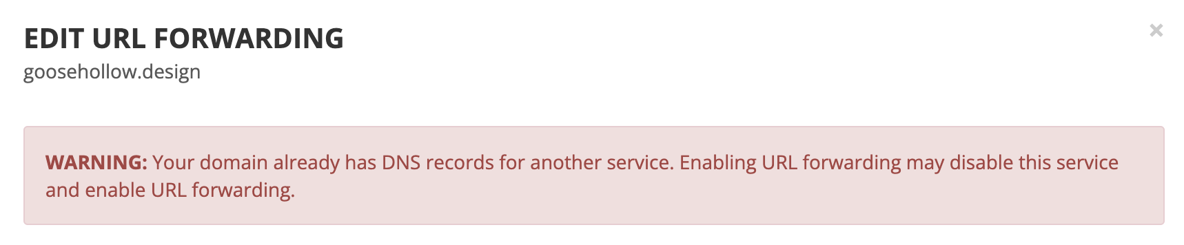 When you open up the menu to create a URL forward, you may see a scary looking error message like this: