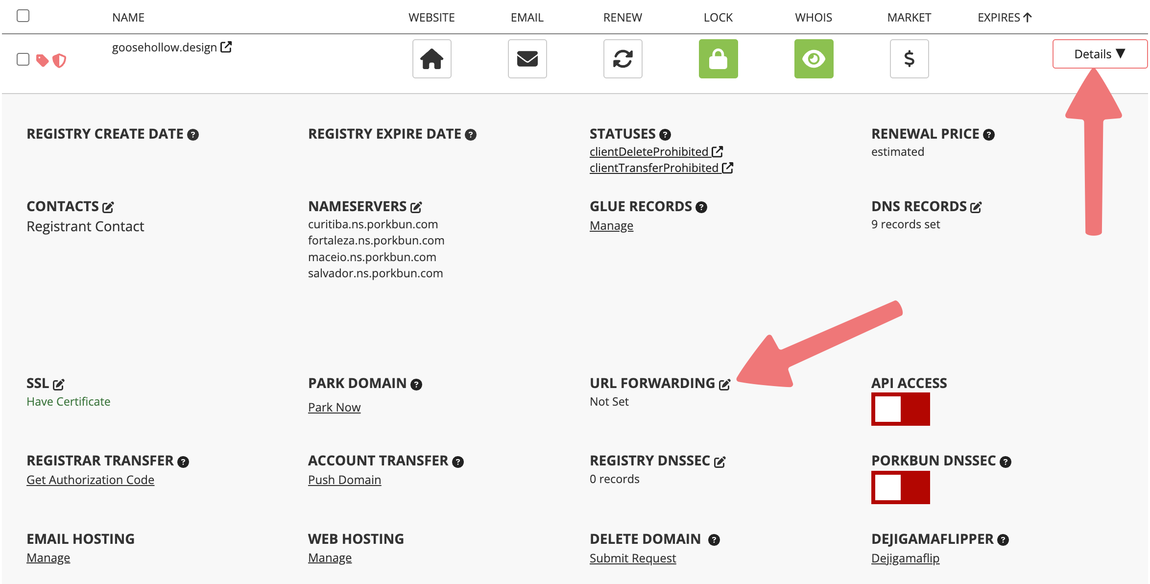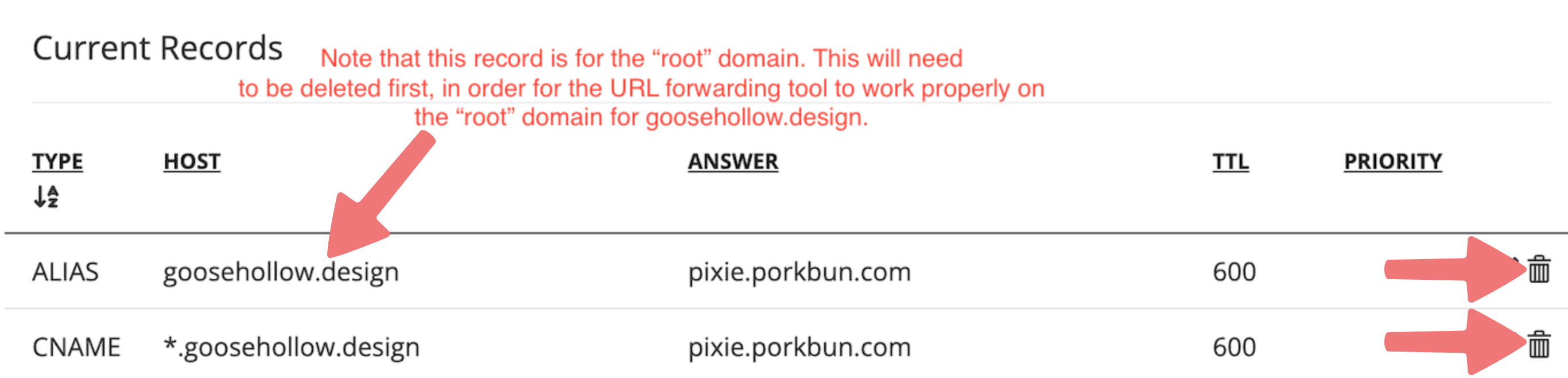 This means that our system has detected some DNS records on your domain that could potentially cause conflicts with the URL forward you're setting up. There are a number of things that can cause this error, but it usually means that Porkbun's default DNS records (pixie.porkbun.com) are still applied to your domain. You'll want to delete any records that could conflict with your URL forward first, then you can set up the redirect afterwards, and everything should start working as expected.