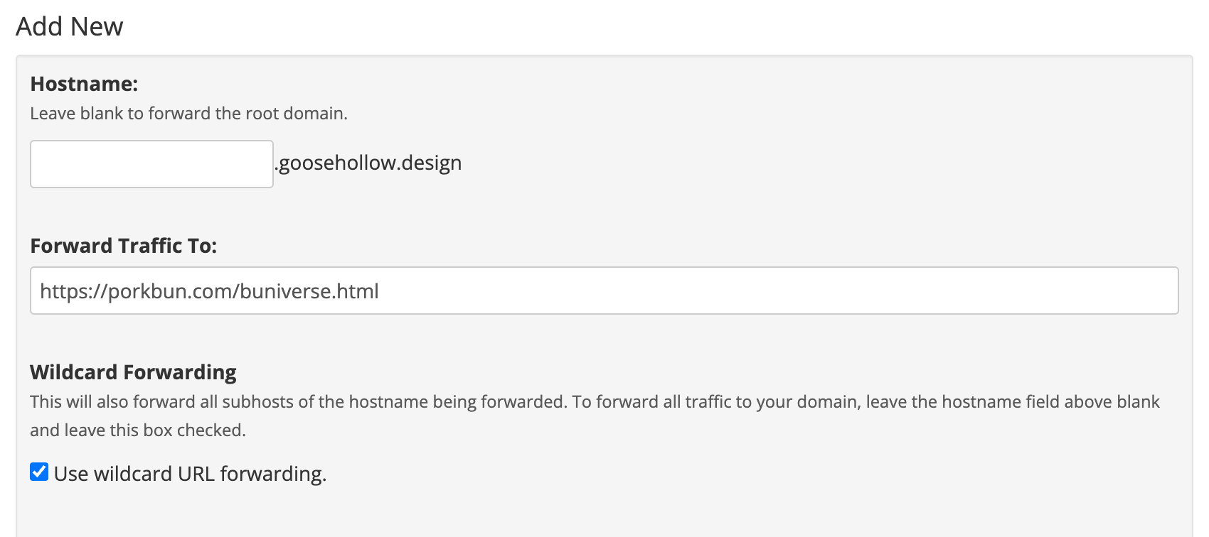 In the "Forward Traffic To" field, input the URL you wish to redirect to. Under the "Wildcard Forwarding" option, check the box if you wish to forward all traffic to the new URL, including your root domain and any subdomains. For more information on wildcard DNS records, you can review this guide.