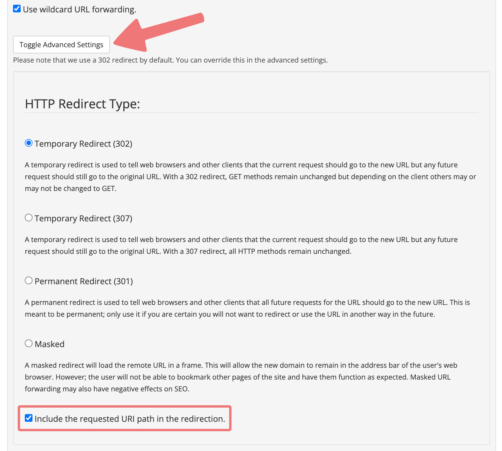 You can also click on the link labeled "Toggle advanced settings" to see some more options for your URL forwarding.