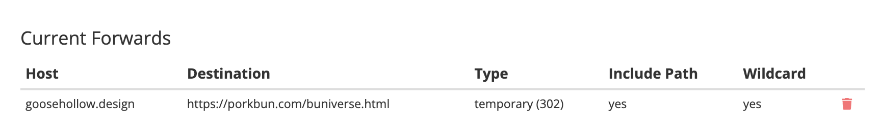 At the bottom of the URL forwarding menu, you should see your newly created redirect under the "Current Forwards" section.